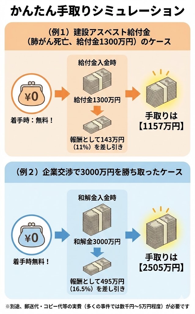 当弁護団では、調査の結果、相手方(国、企業等)から一定の支払いが見込める等と判断される事案について、着手金は頂きません。相手方から実際に支払いがあった場合か、ご依頼の労災申請等が認められた場合にのみ、事件終了時に報酬金を頂きます。