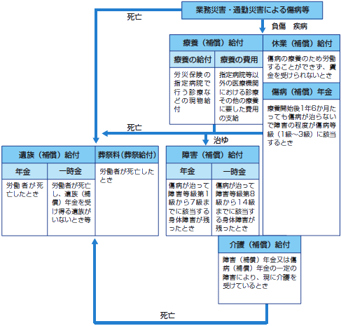 - 遺族(補償)給付及び葬祭料(葬祭給付):遺族に年金又は一時金及び葬祭料の支給