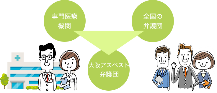 アスベストによる疾患か否かは専門医による診断が必要な場合があります。私たちは、専門医と綿密に連携をとり、必要に応じて相談者に専門医を紹介し、専門医の説明に付き添うなどしてご相談にあたります。