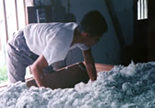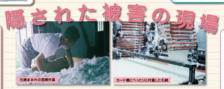 下請けの中小零細・個人事業主が多く、労働環境は劣悪。石綿工場は住宅や田畑と隣り合わせで、「いしわた村」と呼ばれる工場が集中した地区もありました。工場内はもちろん工場の外までが石綿で真っ白。貧しい労働者たちが、厳しい労働環境の中一生懸命働いてきた、その果てに待っていたのが、戦前から現在まで広がる、家族ぐるみ、地域ぐるみのアスベスト被害でした。