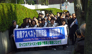 こうして2006年5月26日、日本のアスベスト被害の原点である泉南地域から、全国に先駆けて国の責任を問う訴訟が提起されました。最初に立ち上がった被害者は8名でしたが、2009年9月24日には2陣訴訟が提訴され、最終的に原告は59名(被害者単位)にまで増えました。2010年5月19日、大阪地裁は、1陣訴訟について、わが国で初めてアスベスト被害について国の責任を認める判決を下しました。しかし、2011年8月25日、大阪高裁は、一転して国の責任を否定し、原告を全面敗訴させました。この判決は、人の生命や健康よりも産業の発展を優先すべきと言わんばかりの驚くべき内容でした。